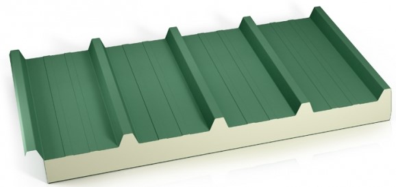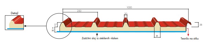 MONTERM TV5 strešni panel je sestavljen iz zunanje pocinkane in obarvane pločevine, vmesnega sloja poliuretanske izolacije različnih debelin ter notranjega zaščitnega sloja iz steklenih vlaken.
