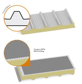 MONTERM TW5-F strešni panel je sestavljen iz zunanje pocinkane in obarvane pločevine, vmesnim izolacijskim slojem mineralne volne različnih debelin ter notranje perforirane pocinkane in obarvane pločevine.